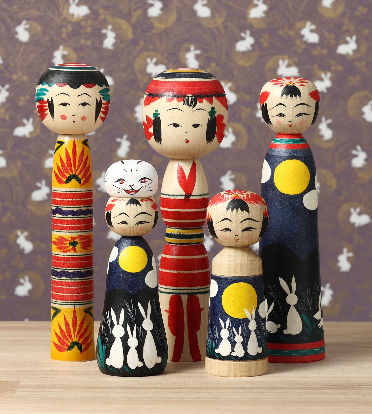 HIRAGA, Teruyuki 平賀輝幸工人 | Otsukimi usagi-harvest moon and rabbit kokeshi doll お月見うさぎこけし | Sakunami style 作並系 | 14cm in height