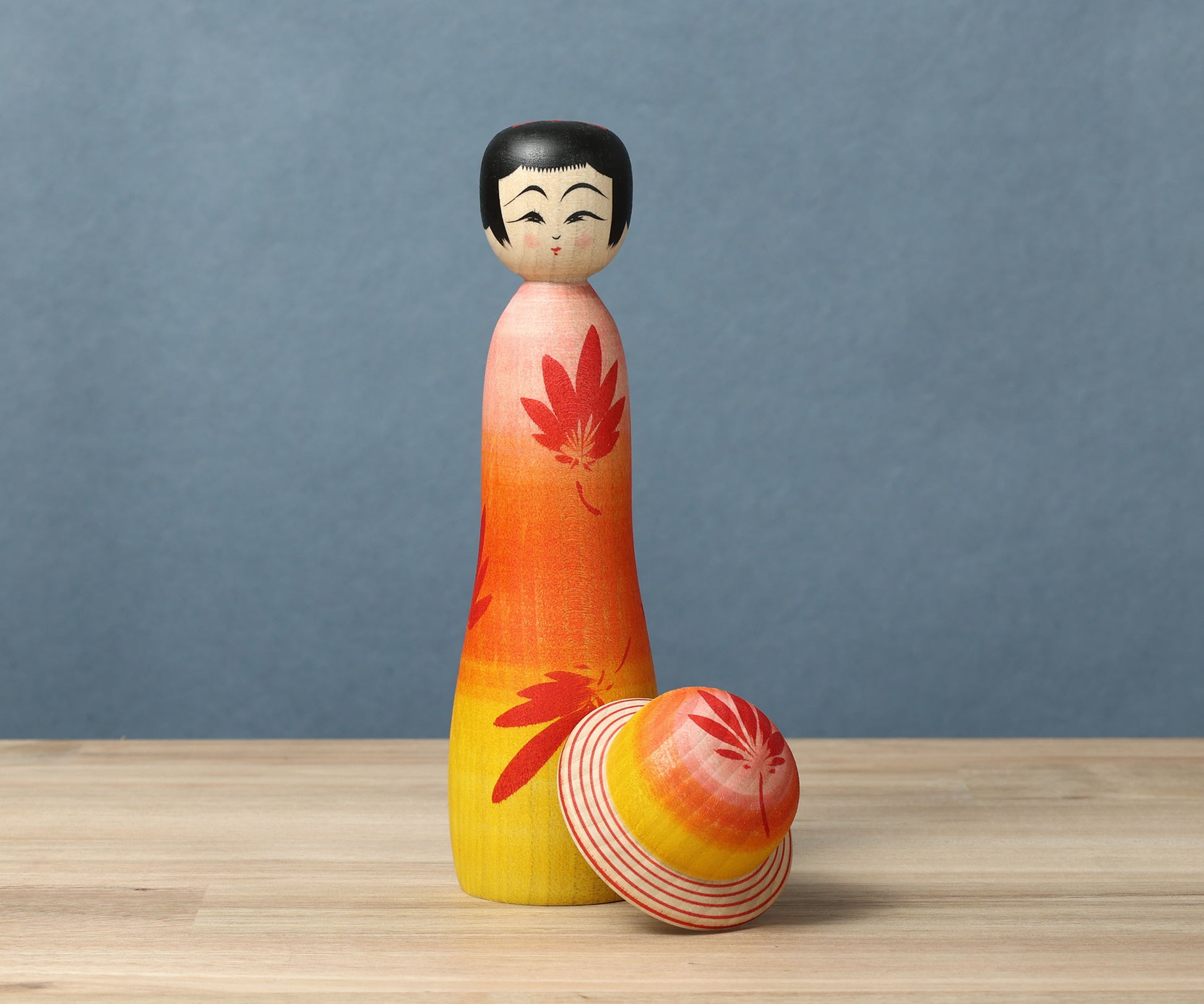 作並系こけし職人、平賀照幸氏の作、帽子をかぶった紅葉こけしです。