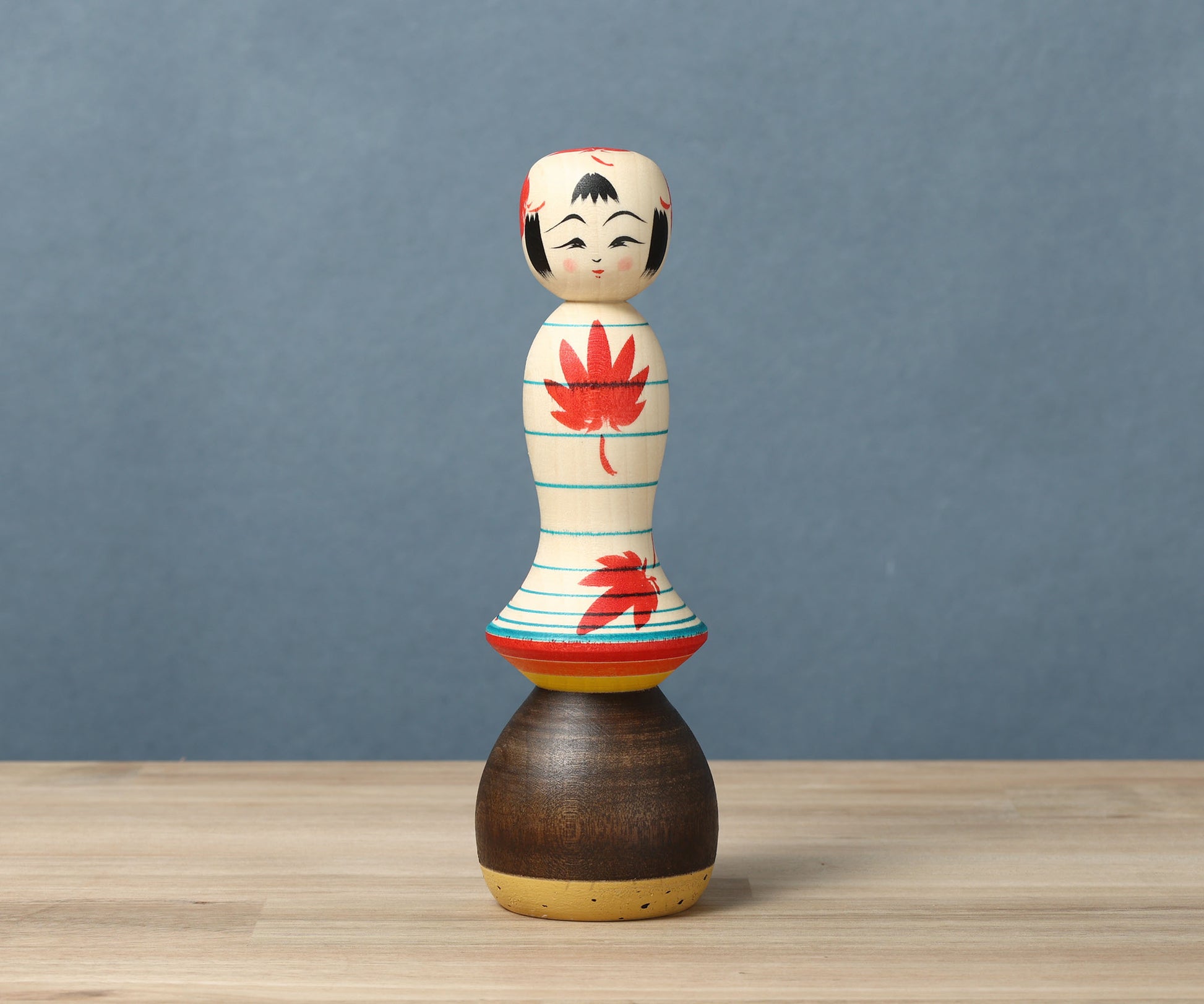 作並系こけしの平賀輝幸職人から届いたもみじこけしです。風に舞うもみじと足元には栗。作並の秋をお手元に運んでくれるこけしです。