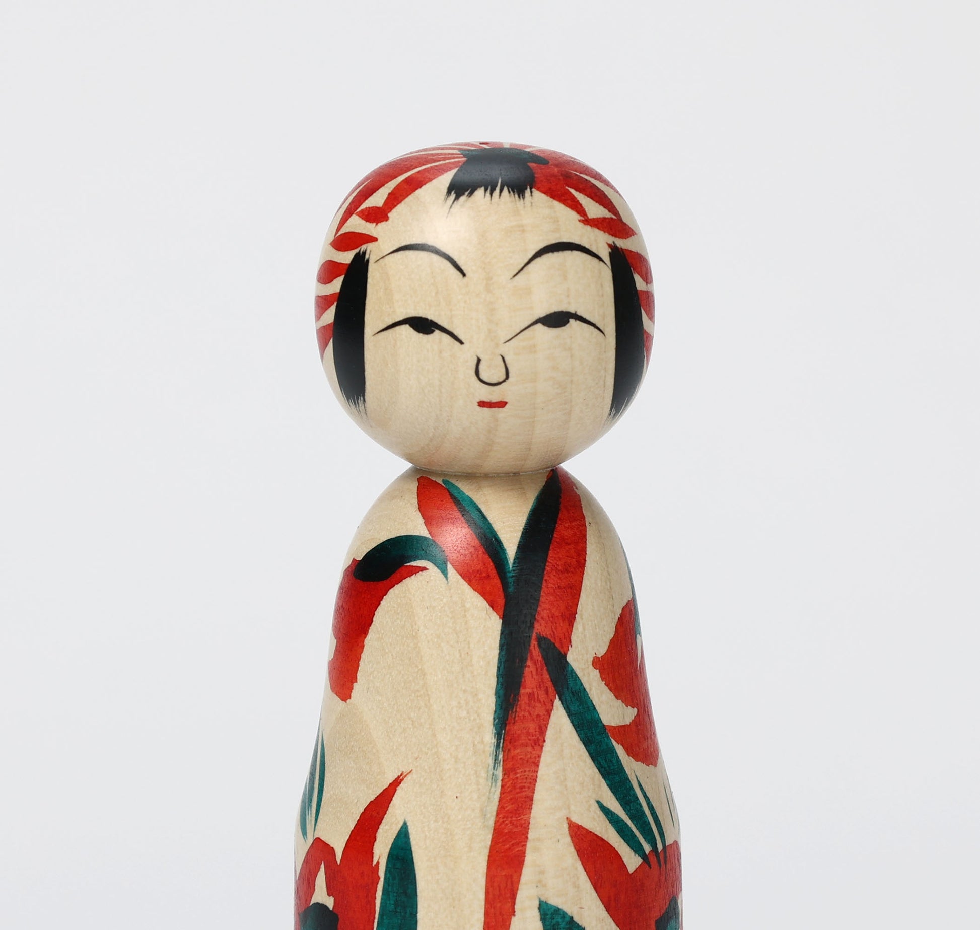 遠刈田系こけし職人、早坂正弘氏による遠刈田系こけしです。胴体には、遠刈田系こけしの特徴である「くずし桜」の花模様が施されています。