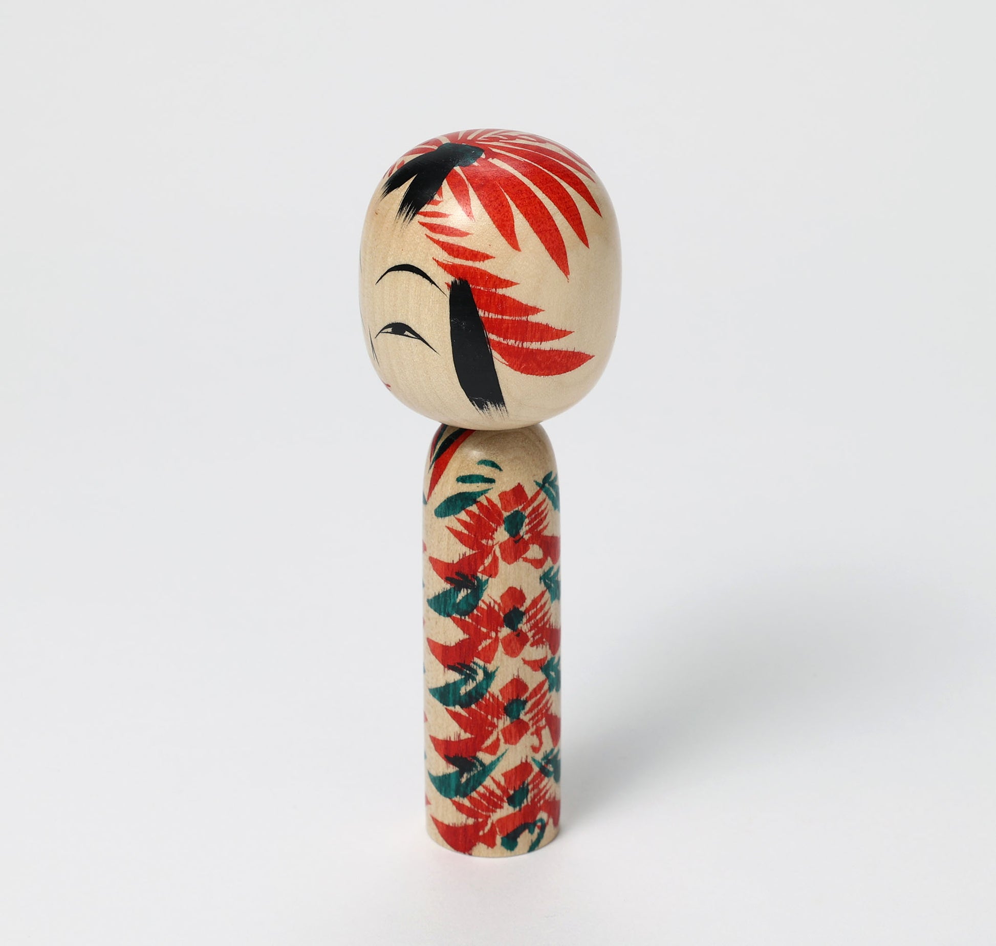 遠刈田系こけし、早坂政弘工人の本人型こけしです。胴体には遠刈田系こけしの特徴である菊の花模様が施されています。