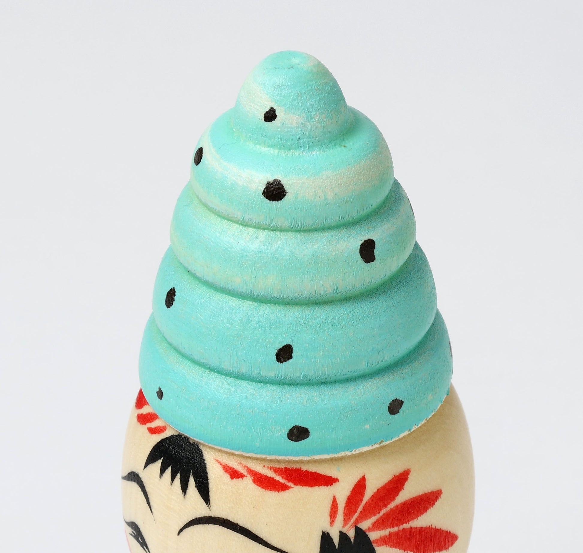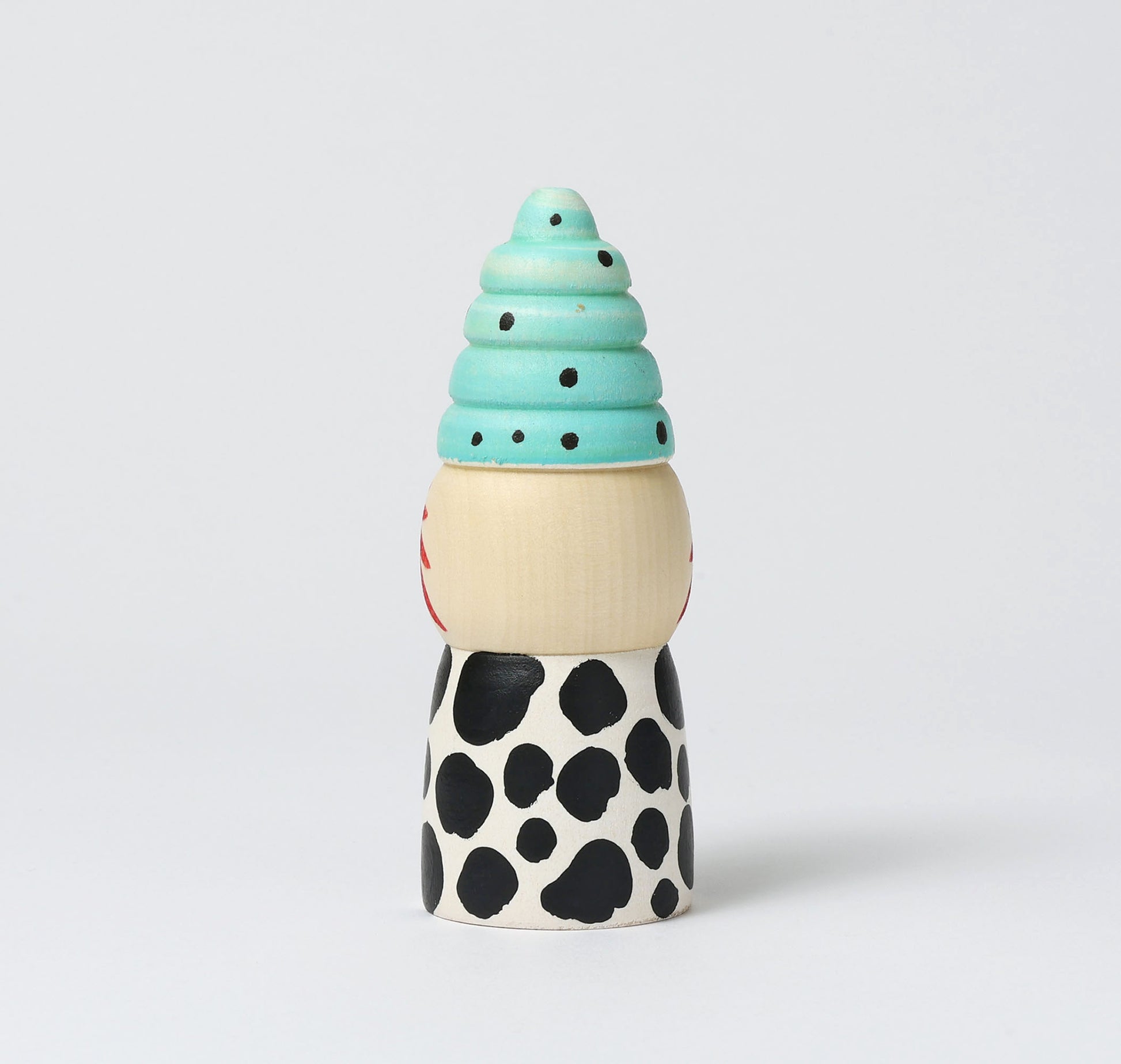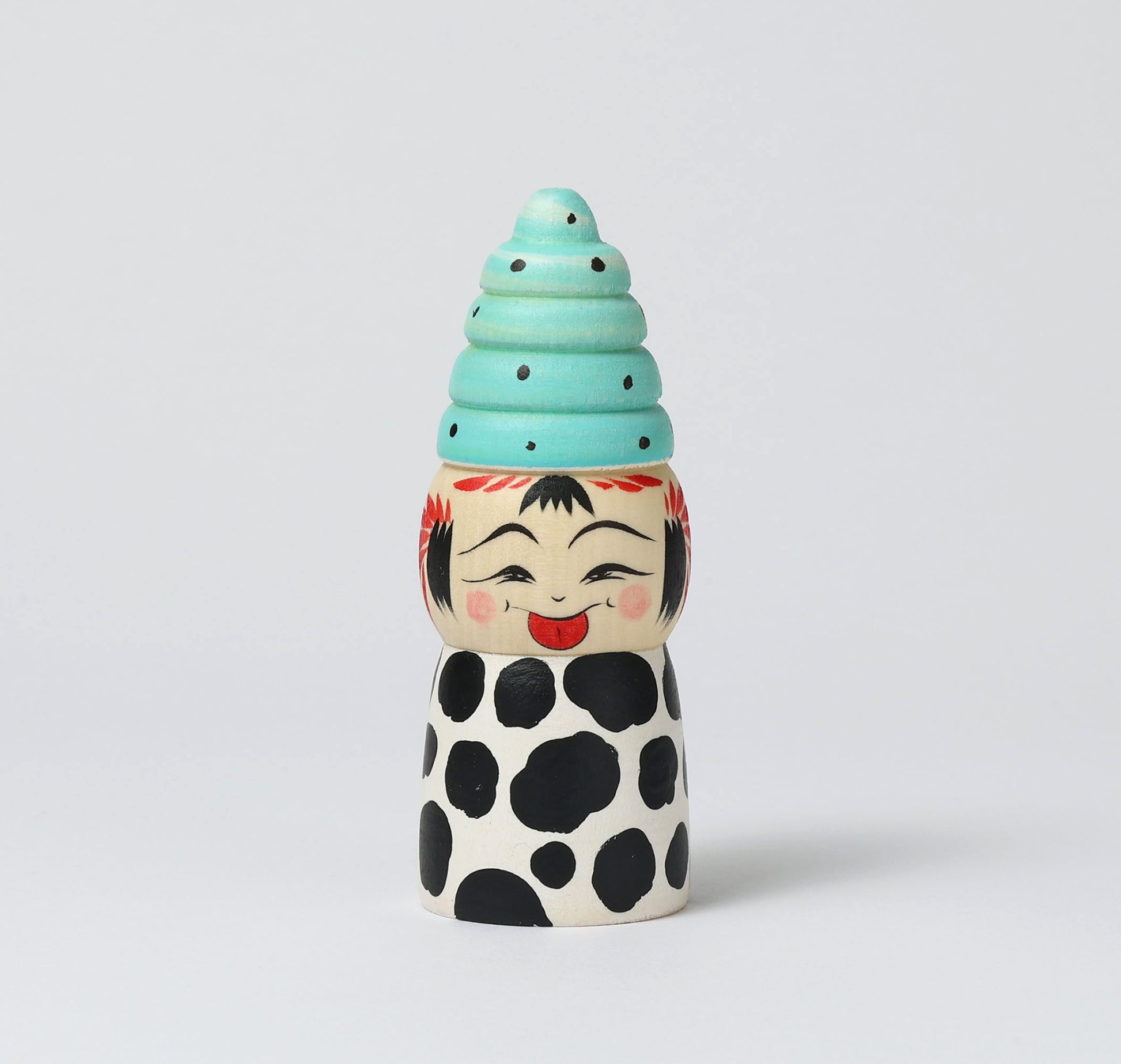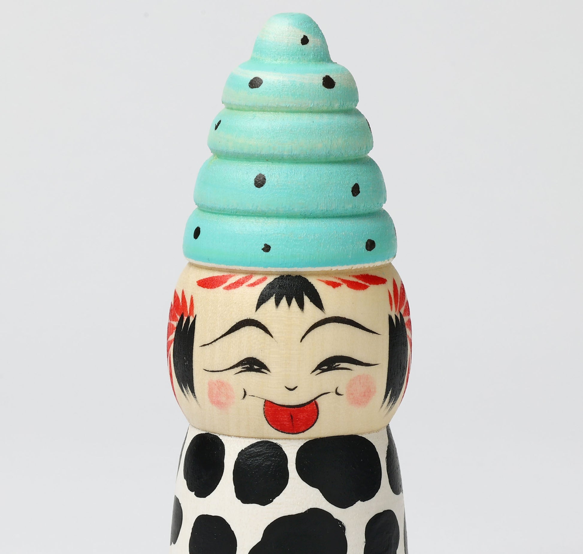 This cute wooden doll, which is wearing ice cream, was made by HIRAGA Teruyuki who is a Sakunami style kokeshi craftsman.