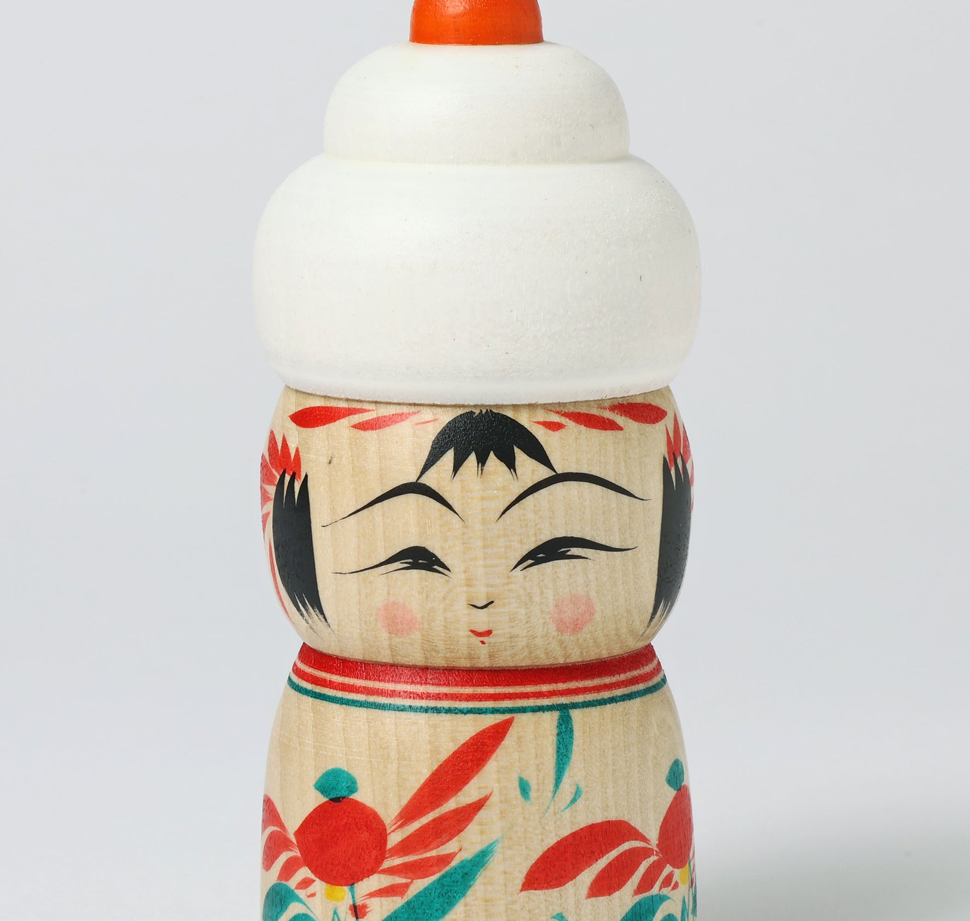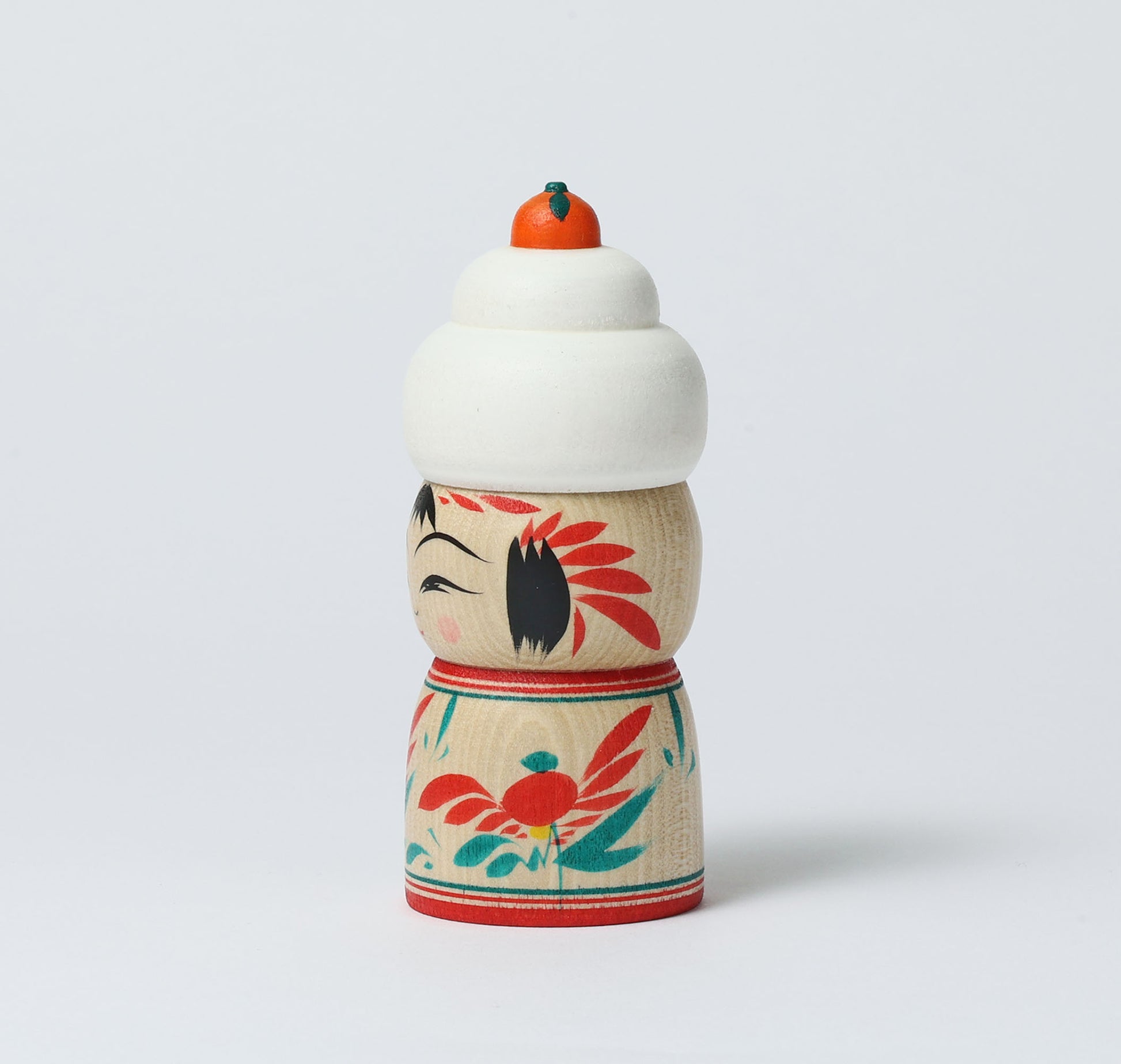 A kokeshi doll with a set of kagamimochi on its head, was made by HIRAGA Teruyuki who is a Sakunami style kokeshi craftsman.