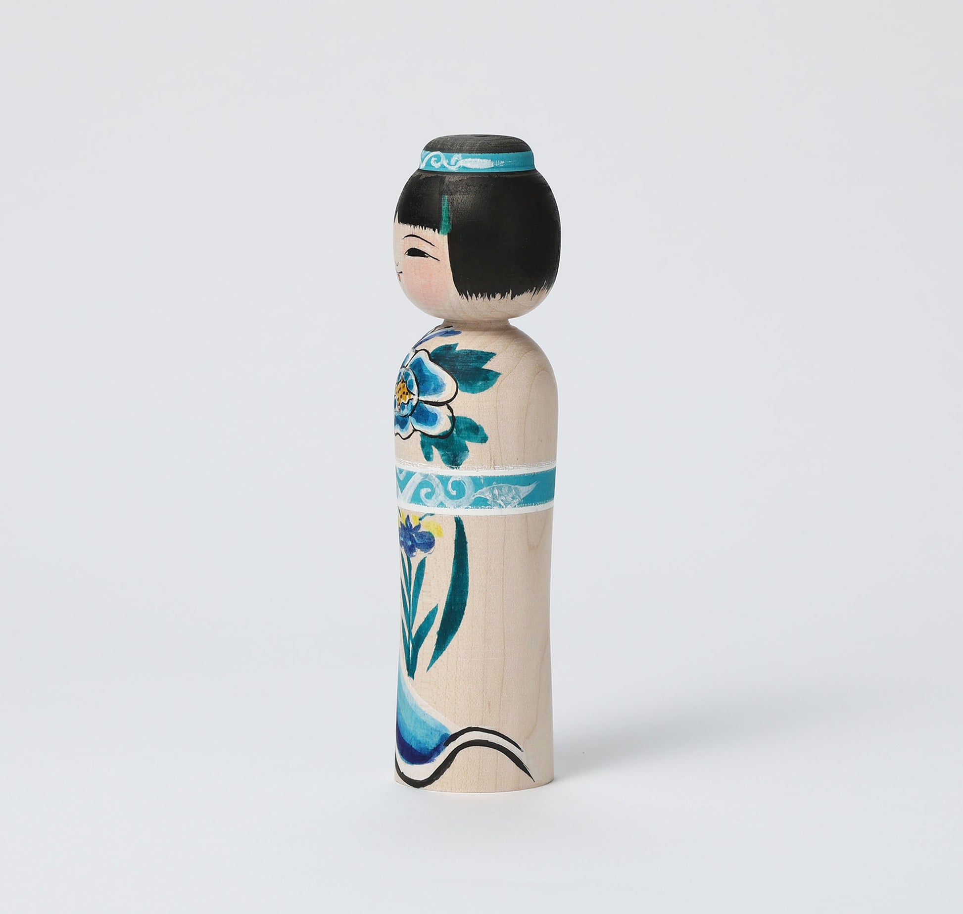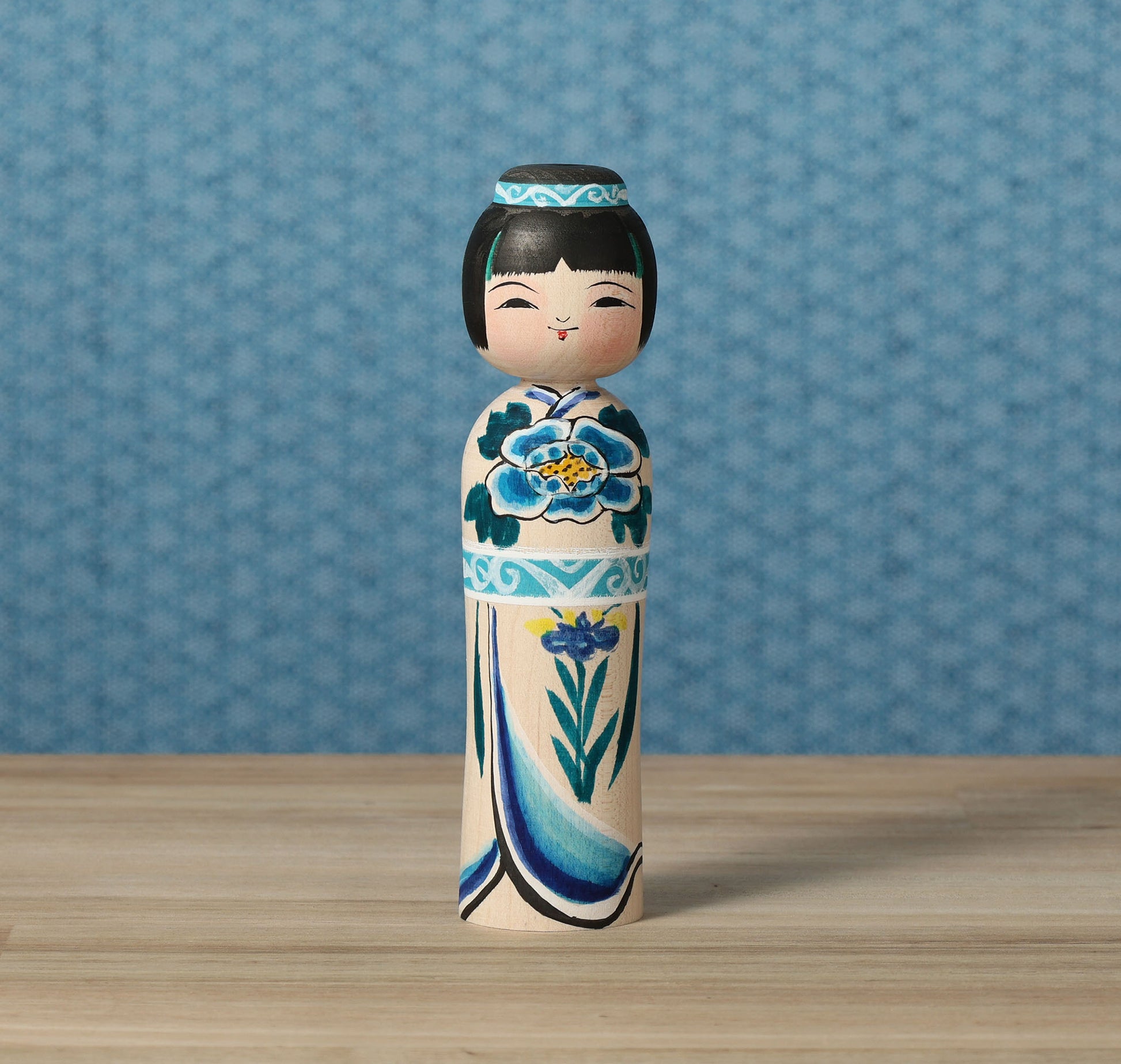 Kinagashi means ‘rough style of kimono’. It has a cool beauty with an elegant kimono. The flower on the body is peony, which is a characteristic of Tsugaru style kokeshi doll.