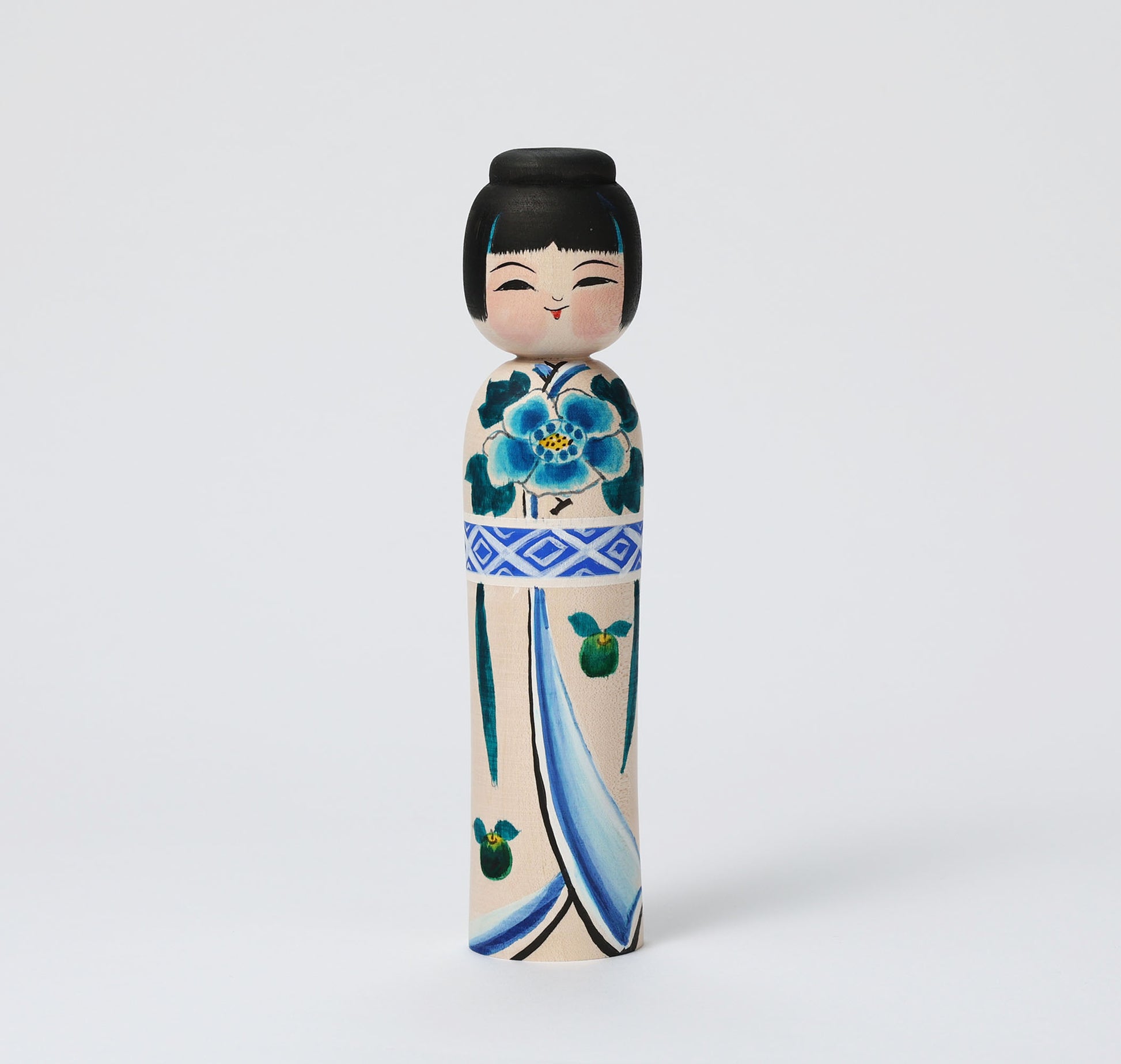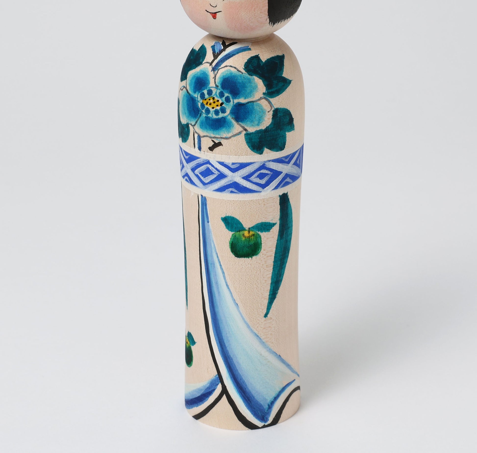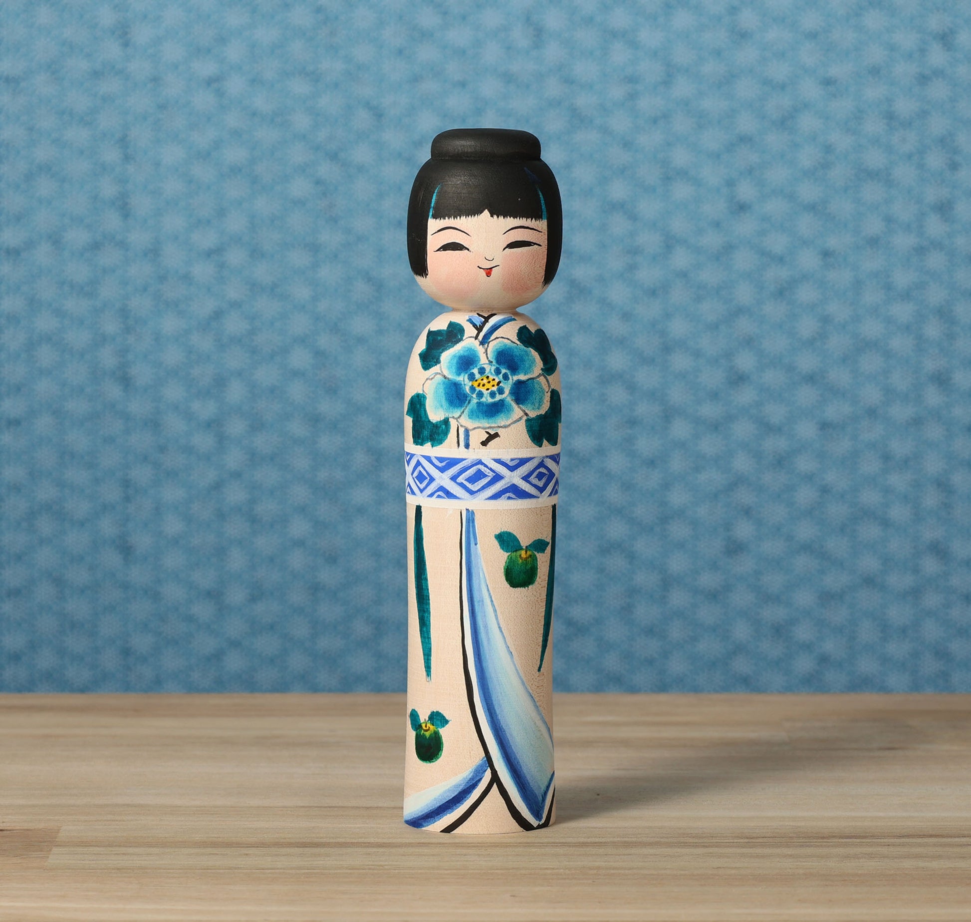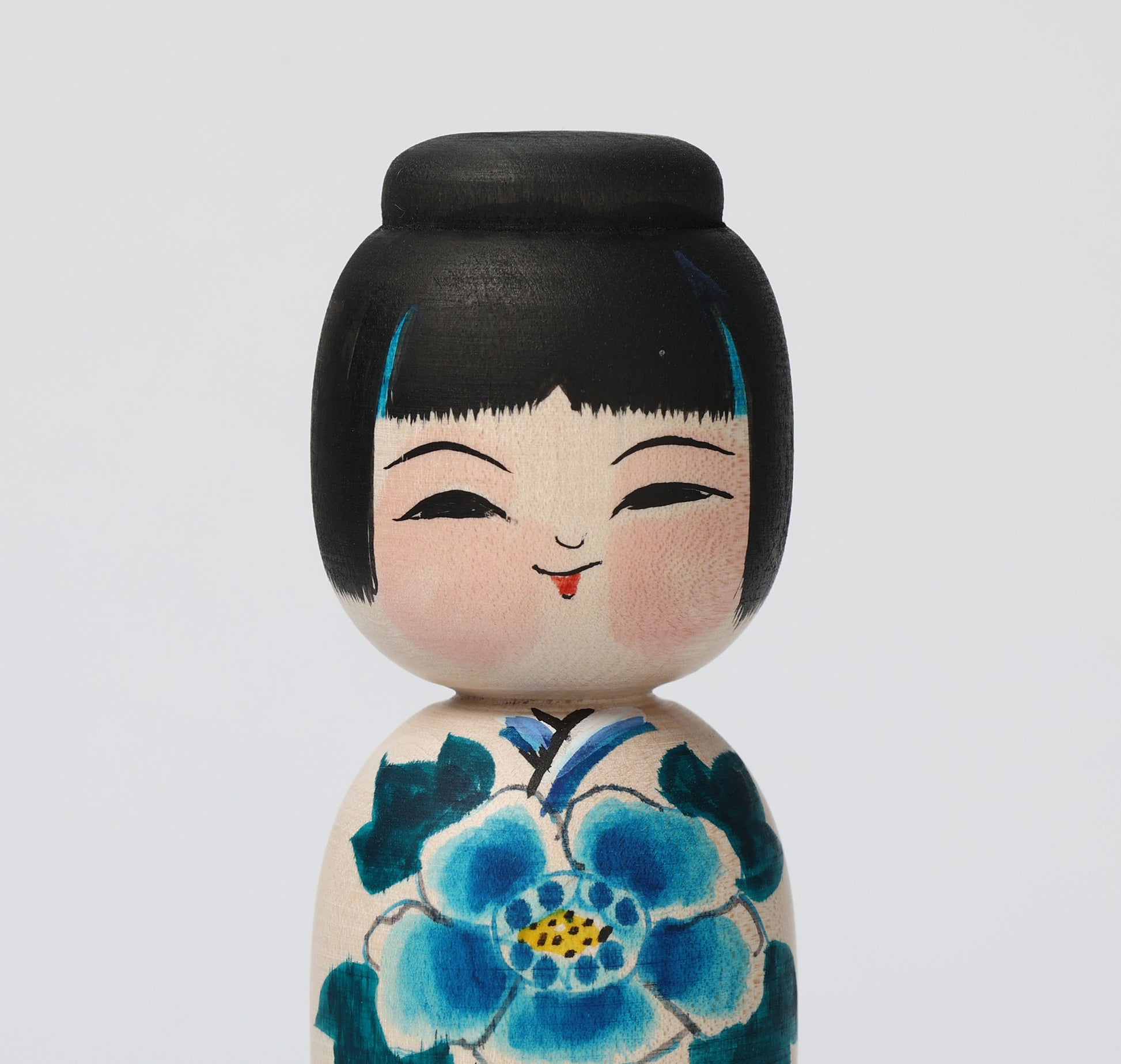 Kinagashi means ‘rough style of kimono’. It has a cool beauty with an elegant kimono. The flower on the body is peony, which is a characteristic of Tsugaru style kokeshi doll.