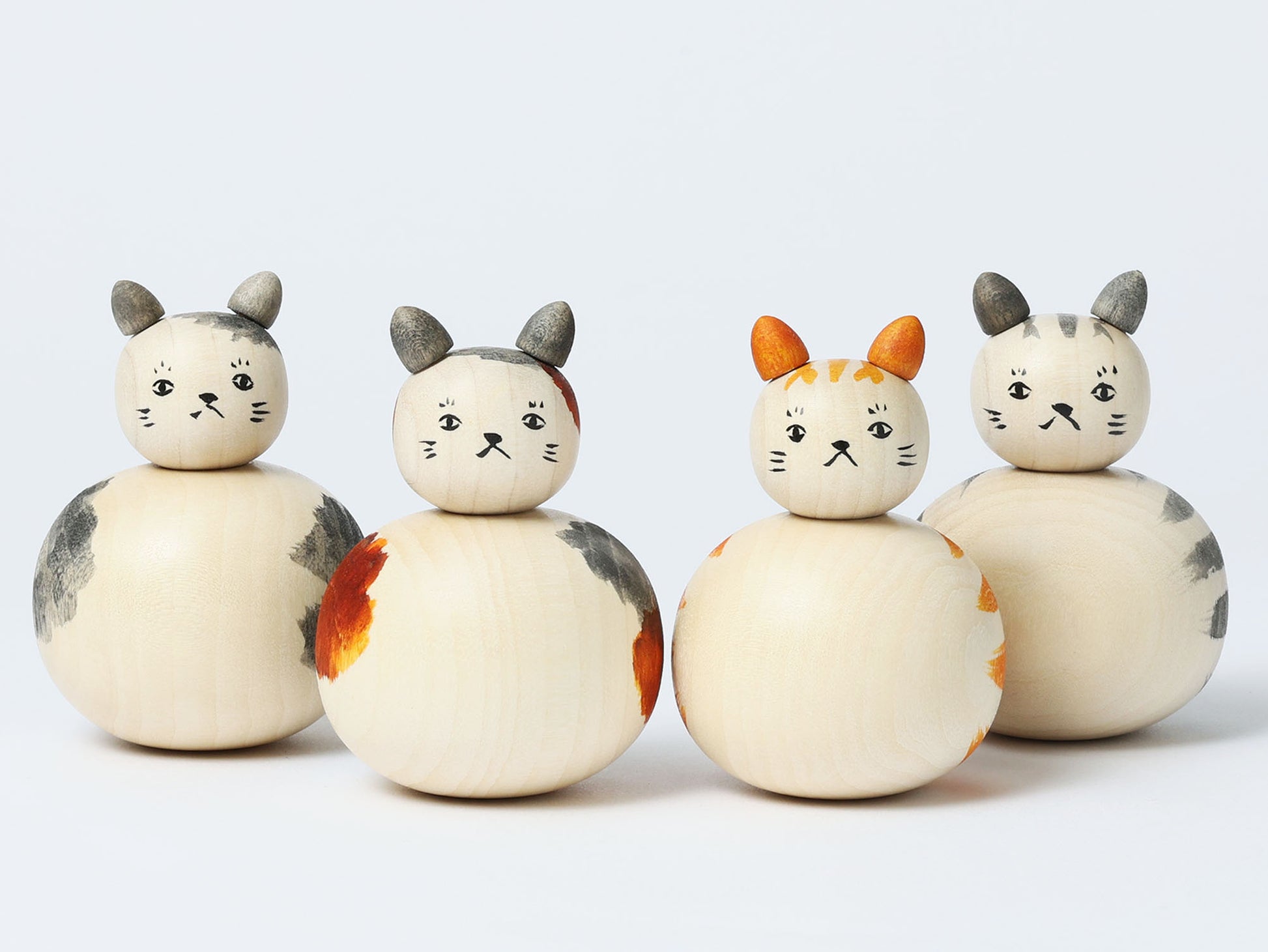 遠刈田系こけしの小山芳美工人から茶色とグレーのトラ、三毛猫、ぶち猫、4種類の猫こけし達が届きました。木地に見える変化はまるで猫の柔らかな毛のようにも見えます。