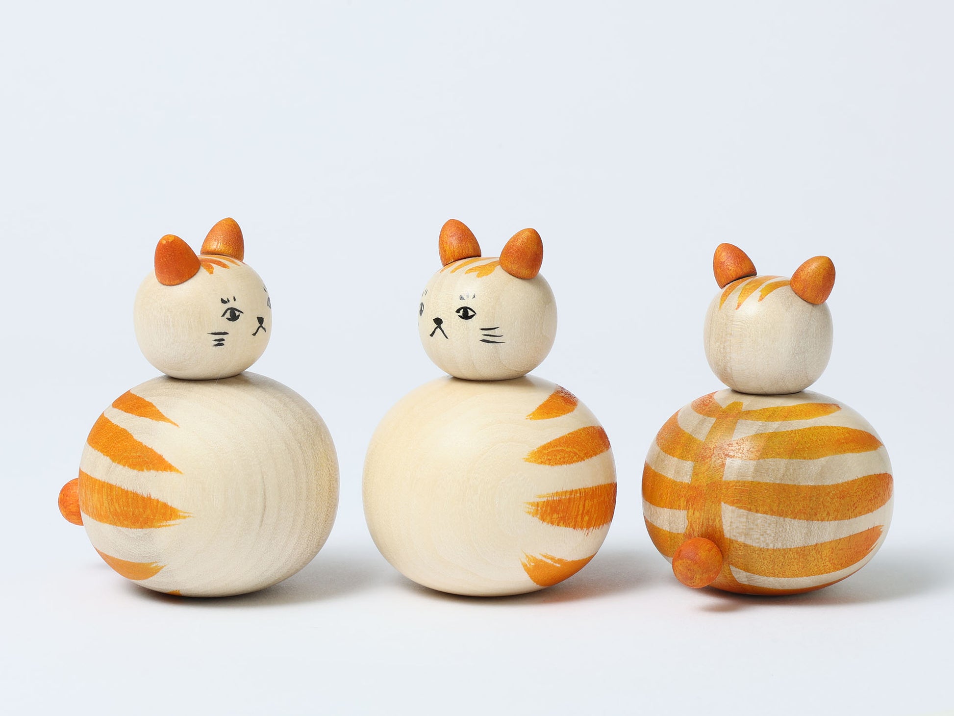 遠刈田系こけしの小山芳美工人から茶色とグレーのトラ、三毛猫、ぶち猫、4種類の猫こけし達が届きました。木地に見える変化はまるで猫の柔らかな毛のようにも見えます。