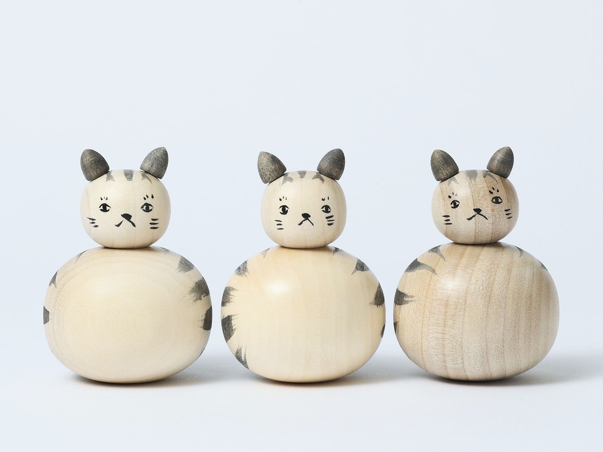 遠刈田系こけしの小山芳美工人から茶色とグレーのトラ、三毛猫、ぶち猫、4種類の猫こけし達が届きました。木地に見える変化はまるで猫の柔らかな毛のようにも見えます。