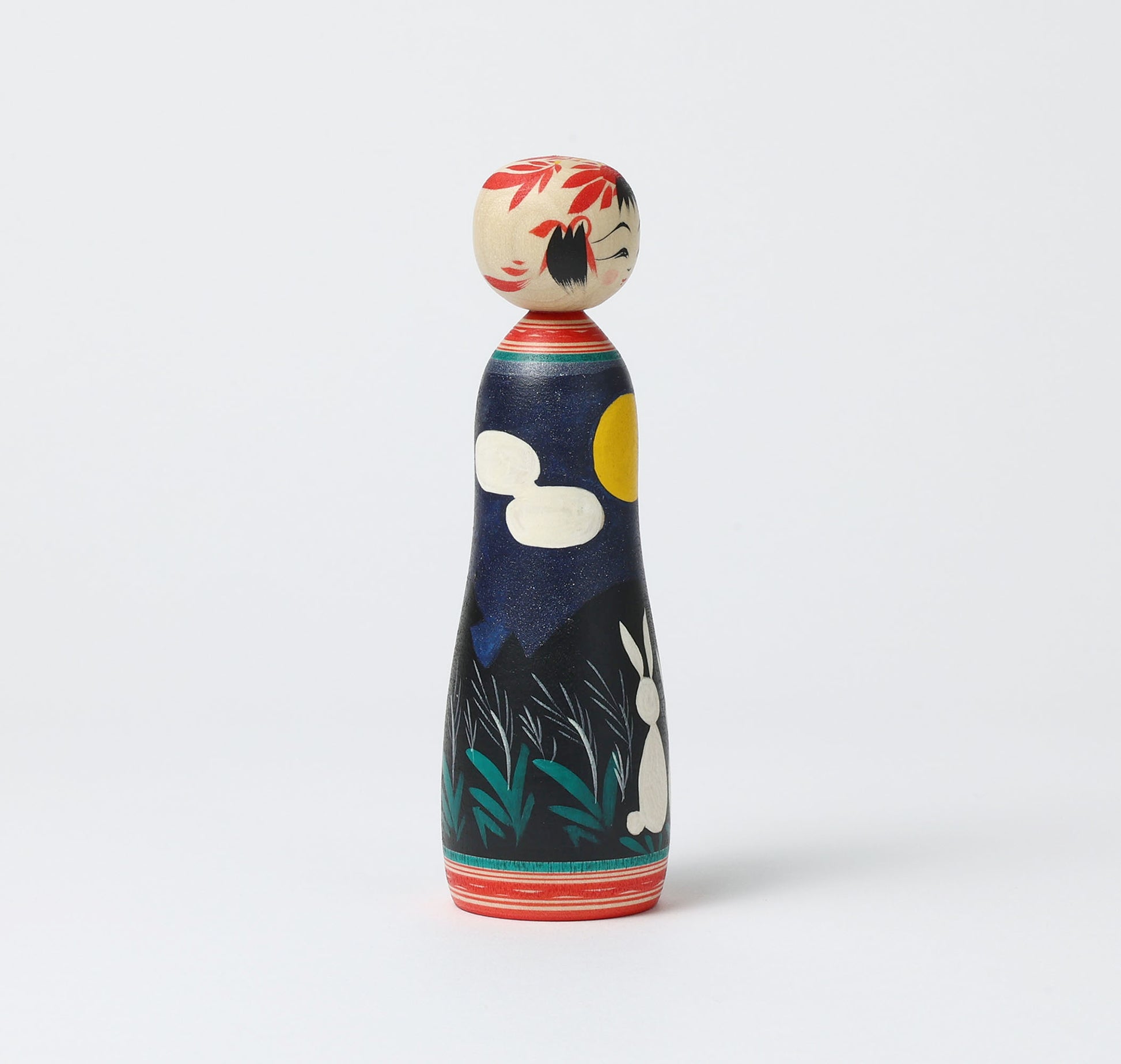 作並系こけしの平賀輝幸工人から届いた、お月見こけしです。まん丸な月と見上げるうさぎ、黒く浮かぶ山や森のシルエットと薄っすらとまかれた銀粉。中秋の名月が輝くこけしです。