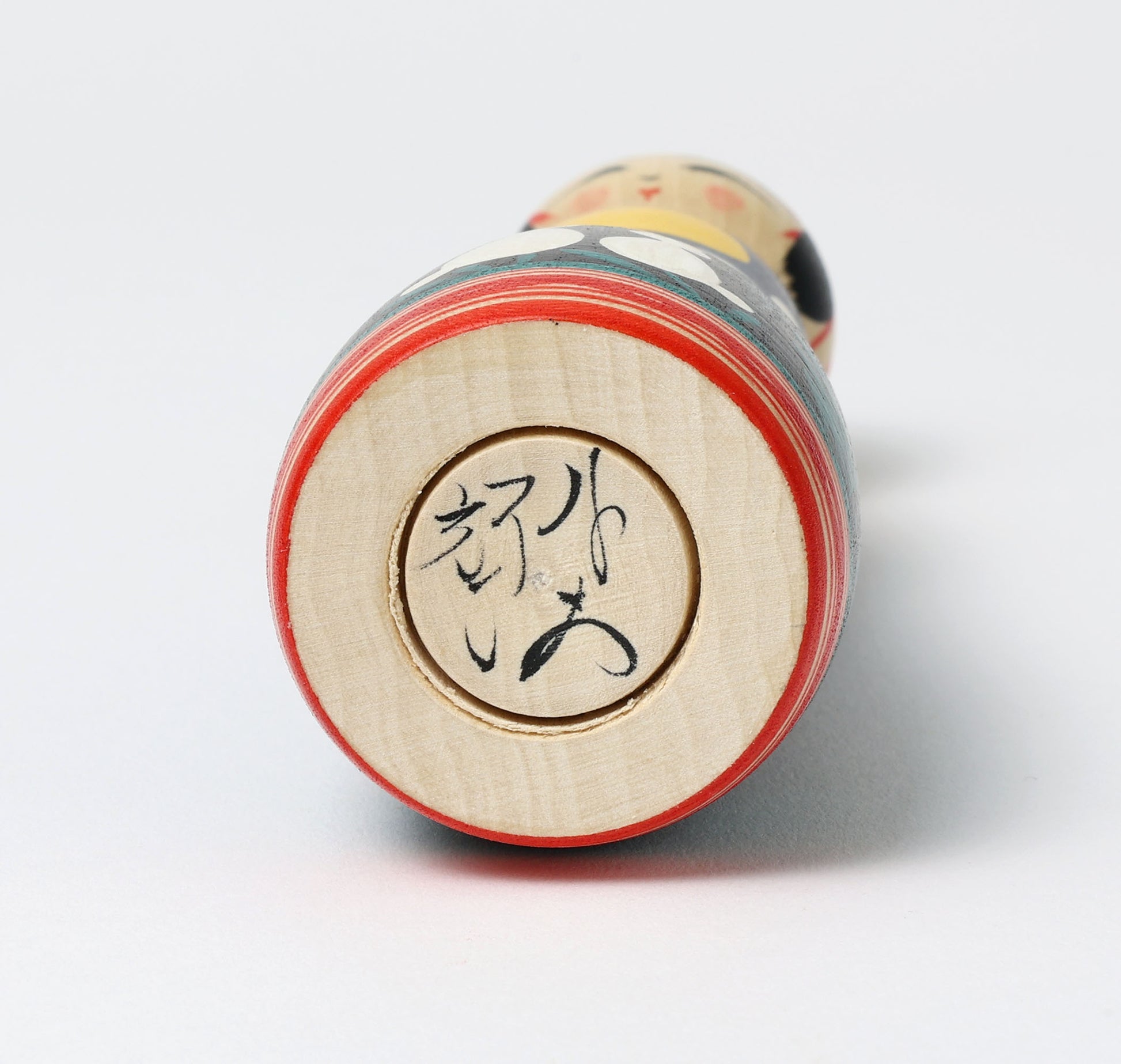 This kokeshi, which has some rabbits and a full moon drawn on it, is called Otsukimi Kokeshi, by Teruyuki HIRAGA (1972-) who is a Sakunami style kokeshi craftsman.