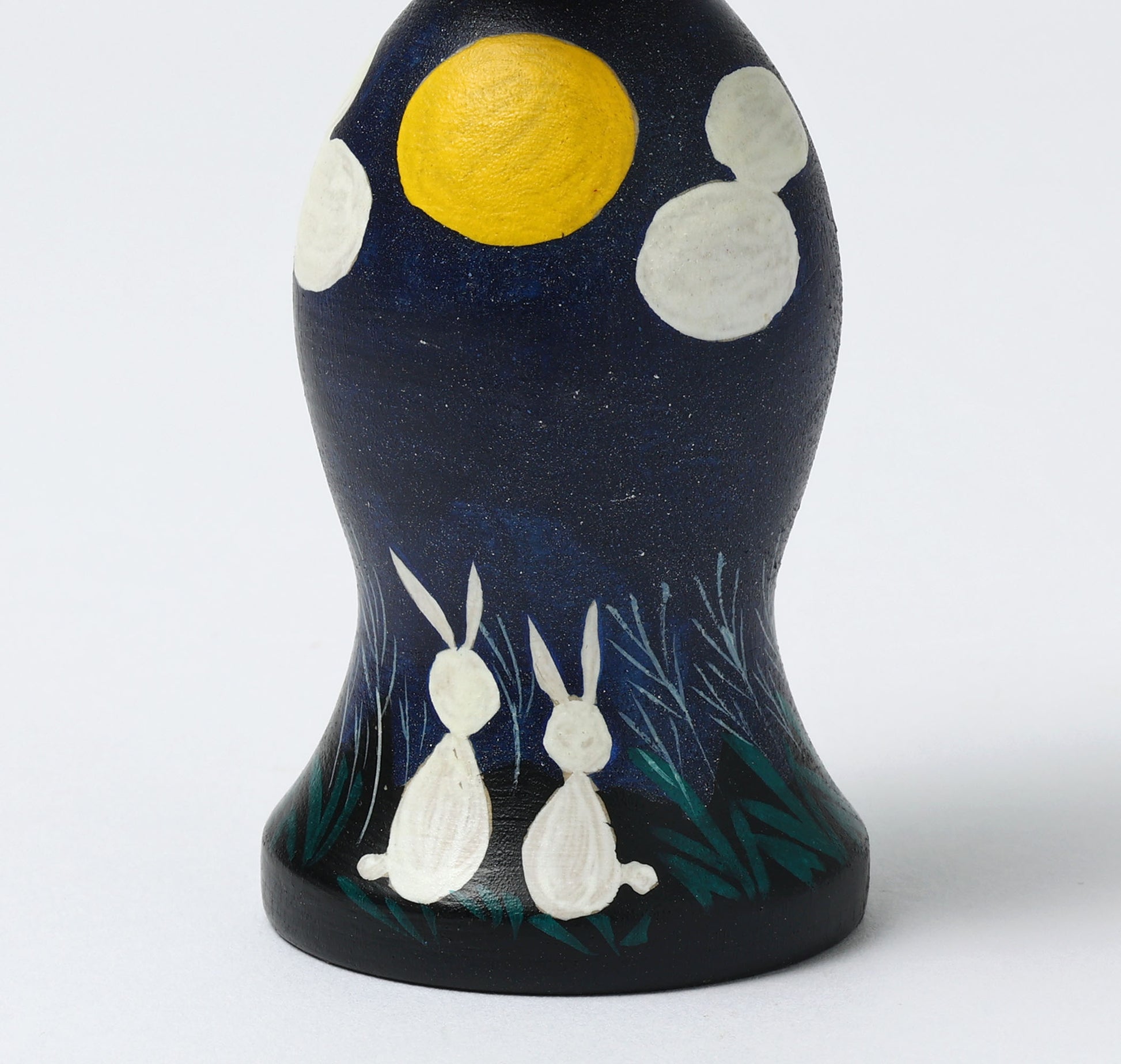 作並系こけしの平賀輝幸工人から届いた、お月見こけしです。まん丸に輝く月と見上げるうさぎ、黒く浮かぶ山や森のシルエットと薄っすらとまかれた銀粉。中秋の名月が描写されたこけしです。