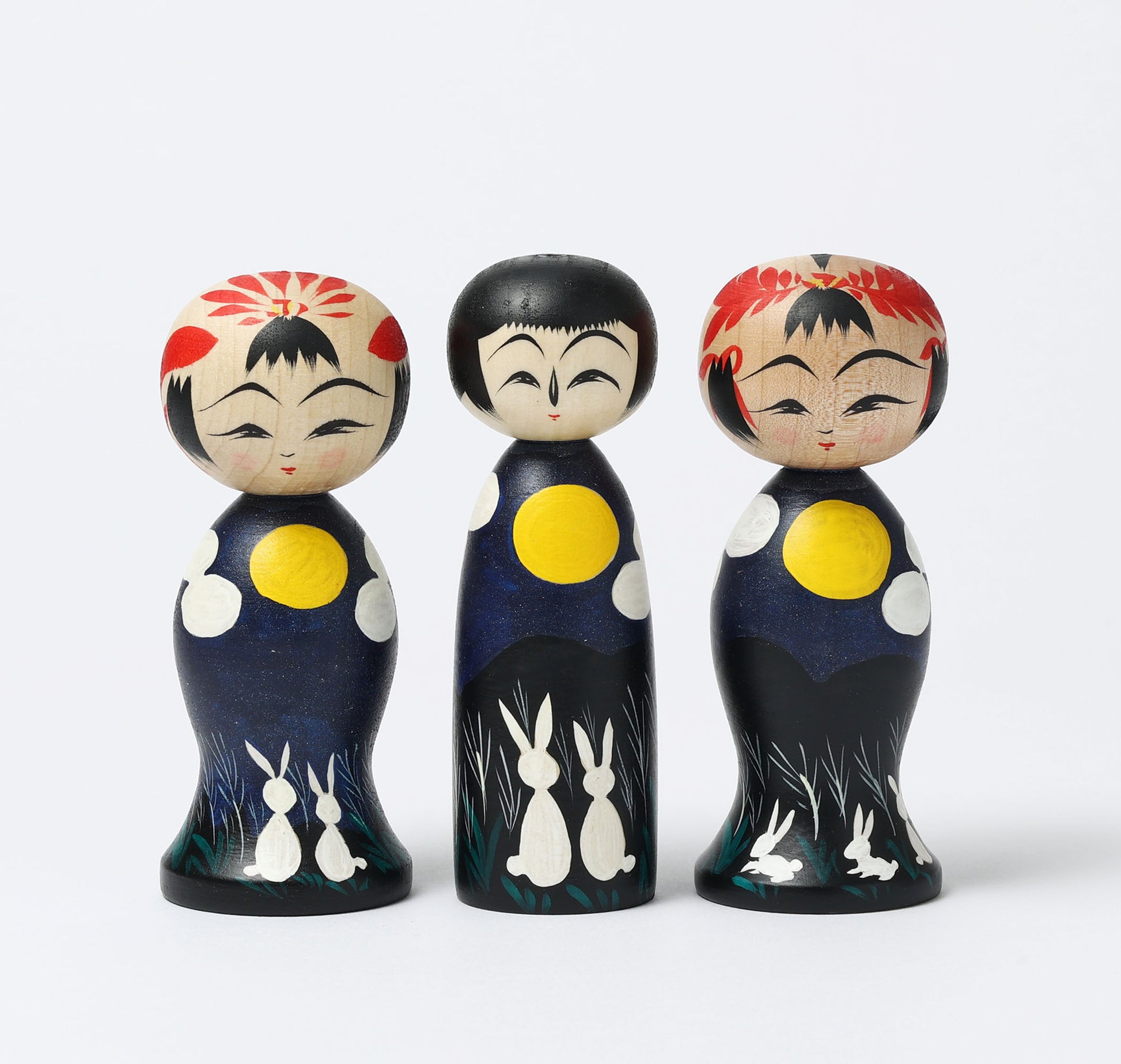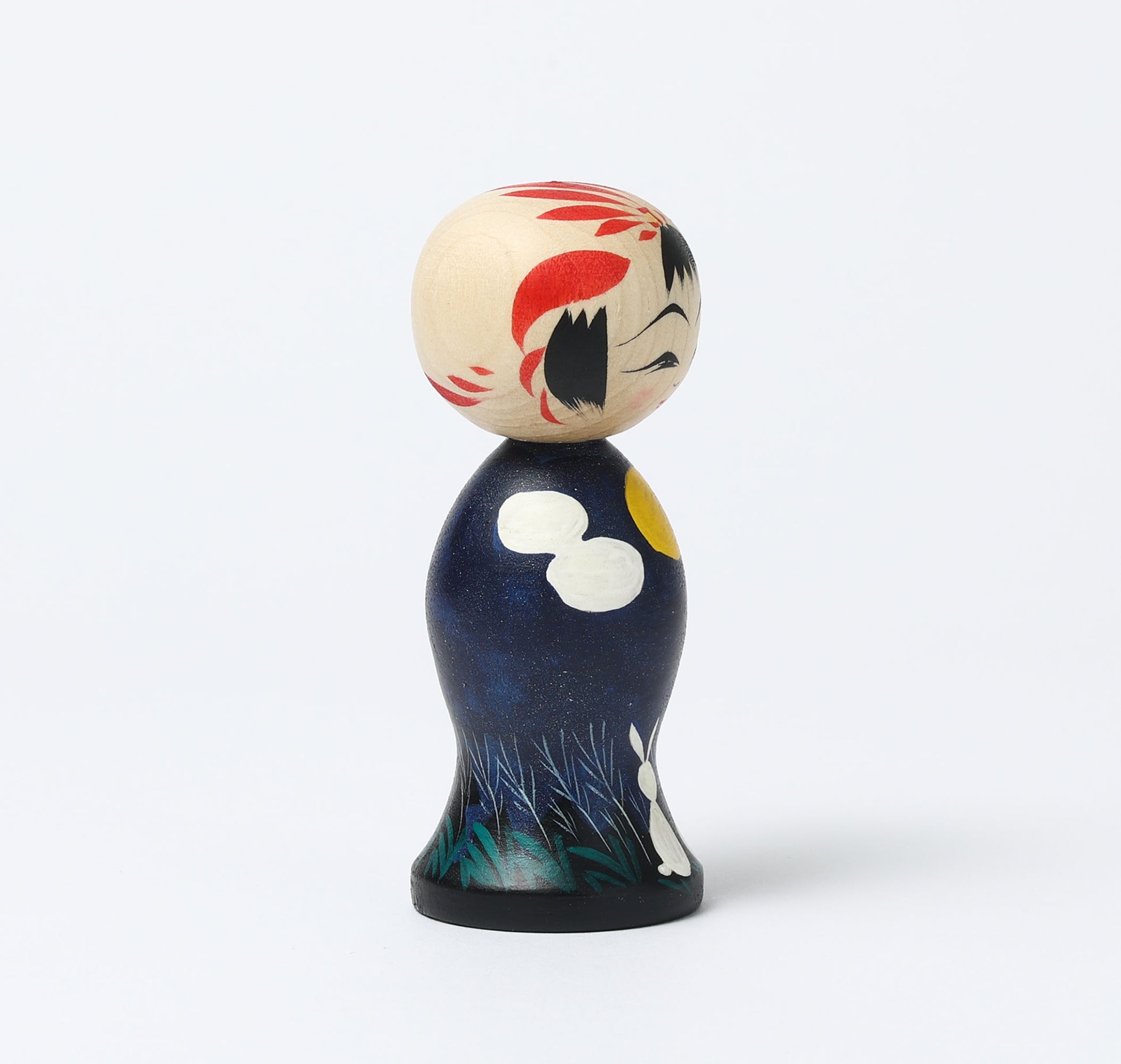 This kokeshi, which has some rabbits and a full moon drawn on it, is called Otsukimi Kokeshi, by Teruyuki HIRAGA (1972-) who is a Sakunami style kokeshi craftsman.