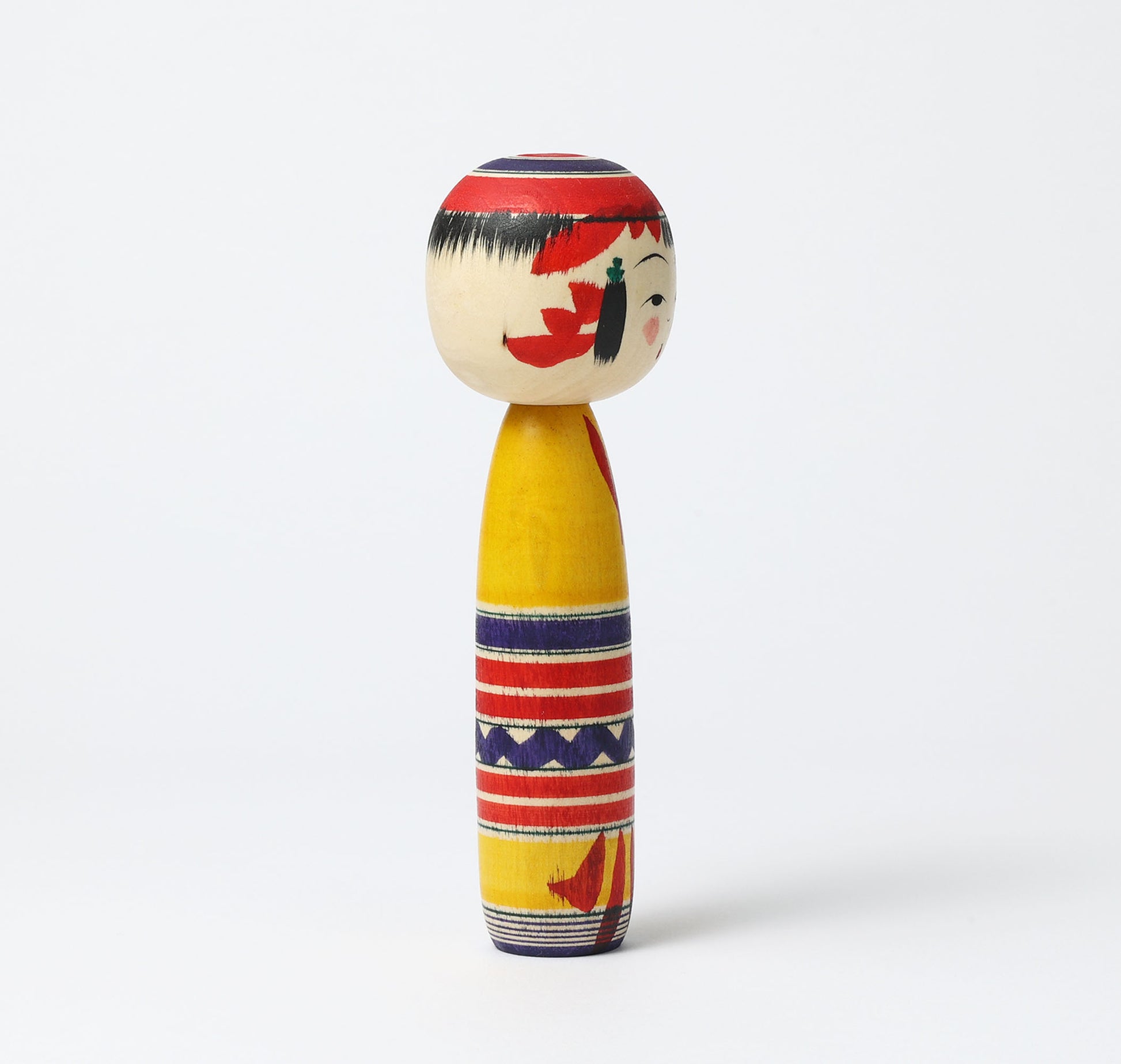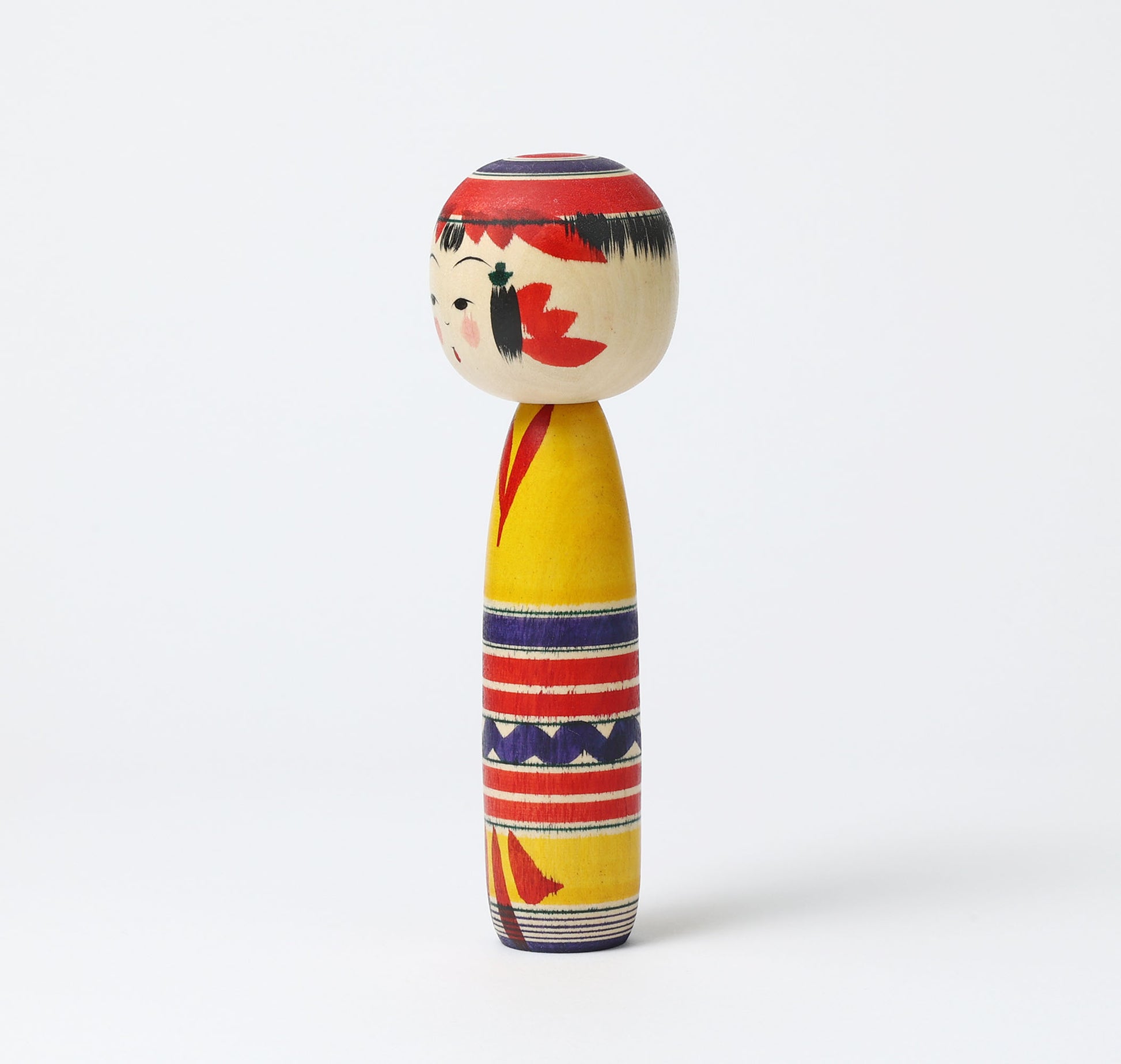 This is a dento Yajiro kokeshi doll, by Shione Ikeuchi who is a Yajiro style kokeshi craftsperson. (‘Dento’ means ‘traditional’ in Japanese.)