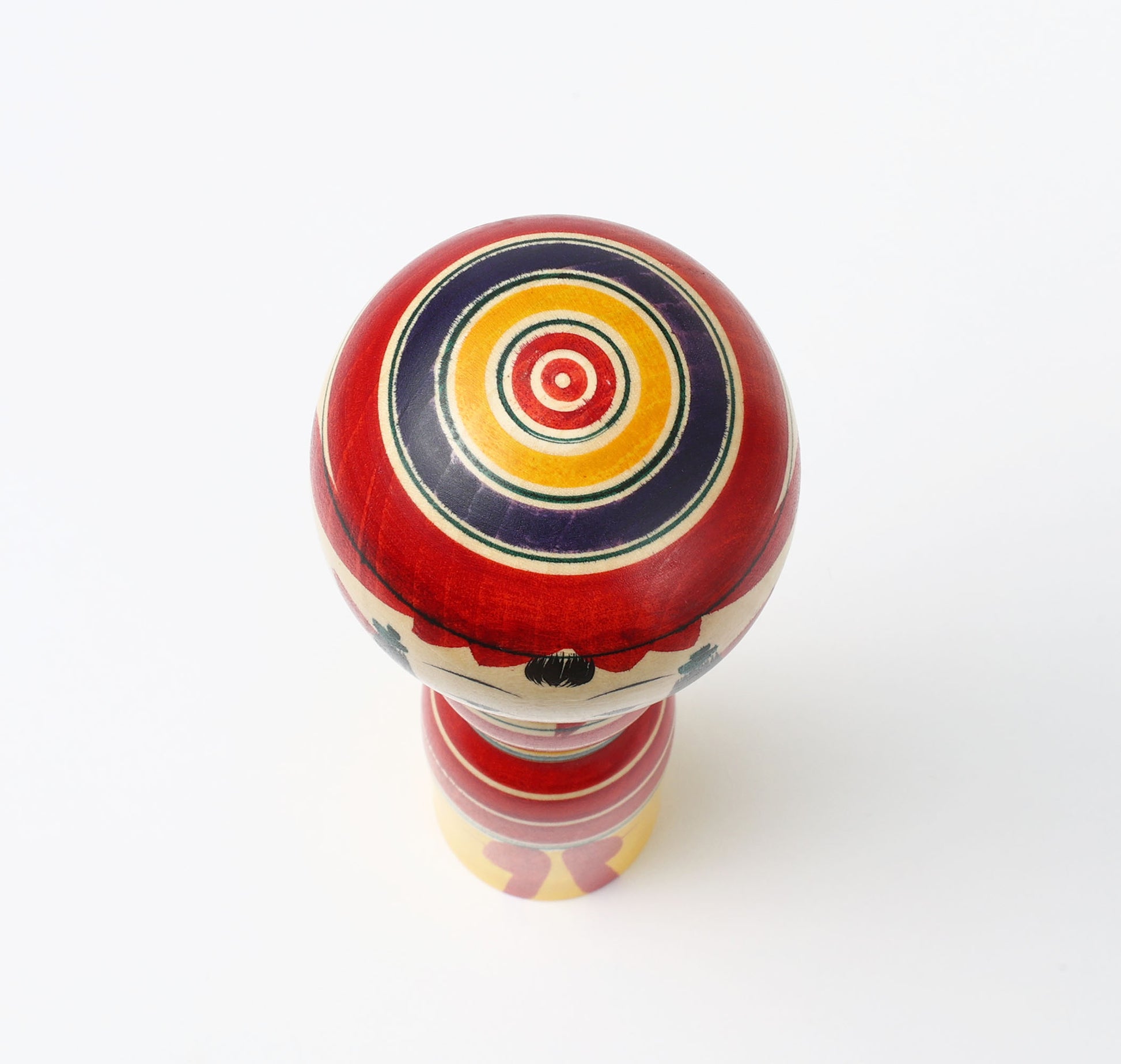 This is a dento Yajiro kokeshi doll, by Shione Ikeuchi who is a Yajiro style kokeshi craftsperson. (‘Dento’ means ‘traditional’ in Japanese.)